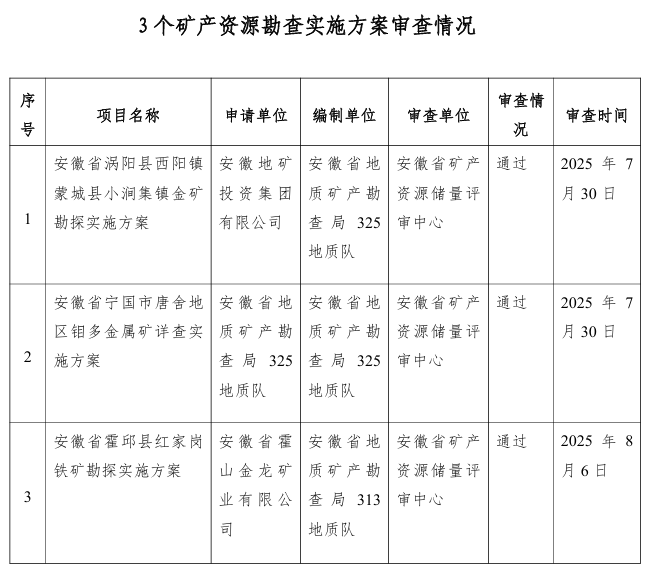公示称,根据《国土资源部办公厅关于规范矿产资源勘查实施方案管理工作的通知》(国土资厅发〔2010〕29号)、《安徽省自然资源厅关于深化矿产资源管理改革进一步规范矿产资源勘查开采登记的通知》(皖自然资规〔2024〕2号)等有关规定,《安徽省涡阳县西阳镇蒙城县小涧集镇金矿勘探实施方案》《安徽省宁国市唐舍地区钼多金属矿详查实施方案》《安徽省霍邱县红家岗铁矿勘探实施方案》通过审查,现将有关情况予以公示。