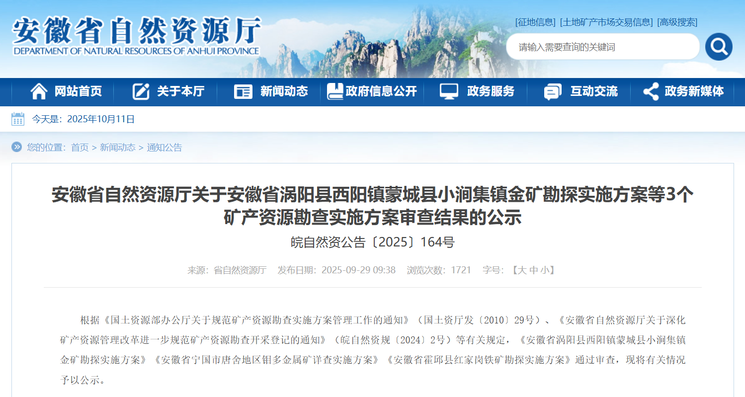 🐬2025-10-11 08:42 「百科/秒懂百科」【 审查结果公示,安徽一地或有金矿,拟勘探!近日,安徽省自然资源厅官网发布关于安徽省涡阳县西阳镇蒙城县小涧集镇金矿勘探实施方案等3个矿产资源勘查实施方案审查结果的公示。】🐙支持:32/64bi🥌系统类型:(官方)官方网站IOS/Android通用版/手机APP(2024APP下载)《审查结果公示,安徽一地或有金矿,拟勘探!近日,安徽省自然资源厅官网发布关于安徽省涡阳县西阳镇蒙城县小涧集镇金矿勘探实施方案等3个矿产资源勘查实施方案审查结果的公示。》